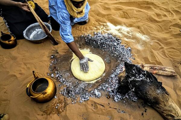 Teeme vaheldumisi jalutuskäike ja lühikesi autosõite siinsel maalilisel maastikul. Me läbime tohutud skulptuursed amfiteatrid tohutute koobastega, mida kaunistavad muljetavaldavad kaared. Liiv klammerdub kaljudele punastes ja ookri toonides. Paneme püsti oma laagri keset luiteid, mis on hajutatud kiviste tornikestega, mis kõrguvad kaljude poole. Päev lõpeb õhtusöögi ja kõrbelaagriga Moulis N’Aga.