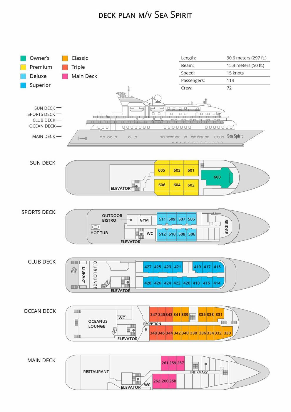 Need 21m² suurused kajutid asuvad Oceanuse tekil . Kajutites on aken, kaks garderoobi, kaks üheinimese või üks King size voodi, seif, külmkapp, võimalus kasutada satelliittelefoni, TV/DVD, individuaalne ruumi termoregulaator, föön.