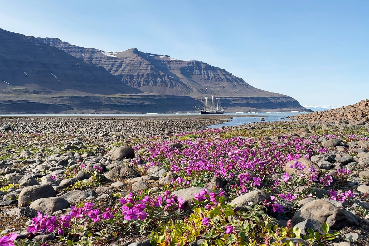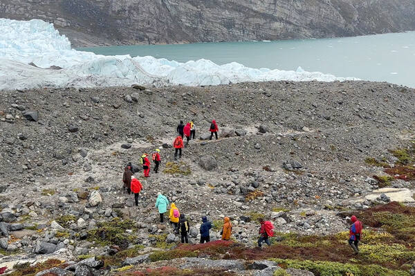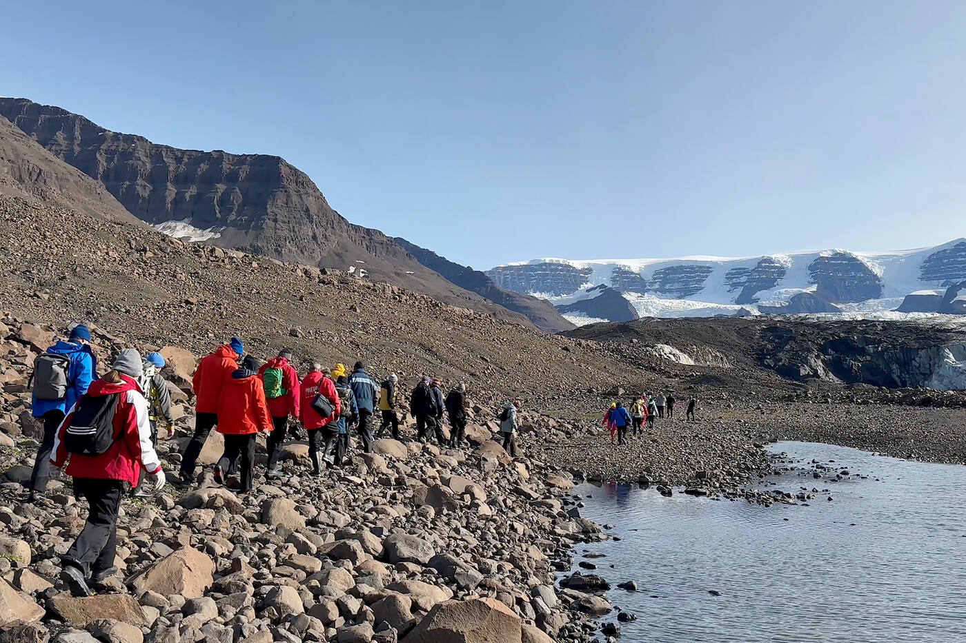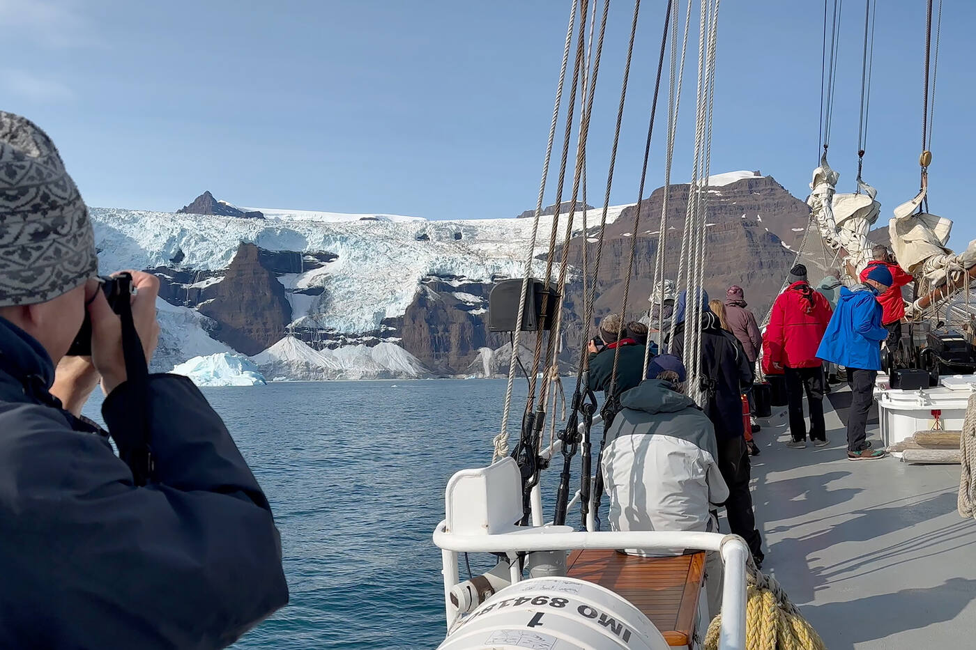 Seilame liustiku jääga kaetud Vloquart Boons rannikut mööda. Månegletcher või Vikingebugti abaja juures saame Zodiac paatidega teha maabumisi liustikule.