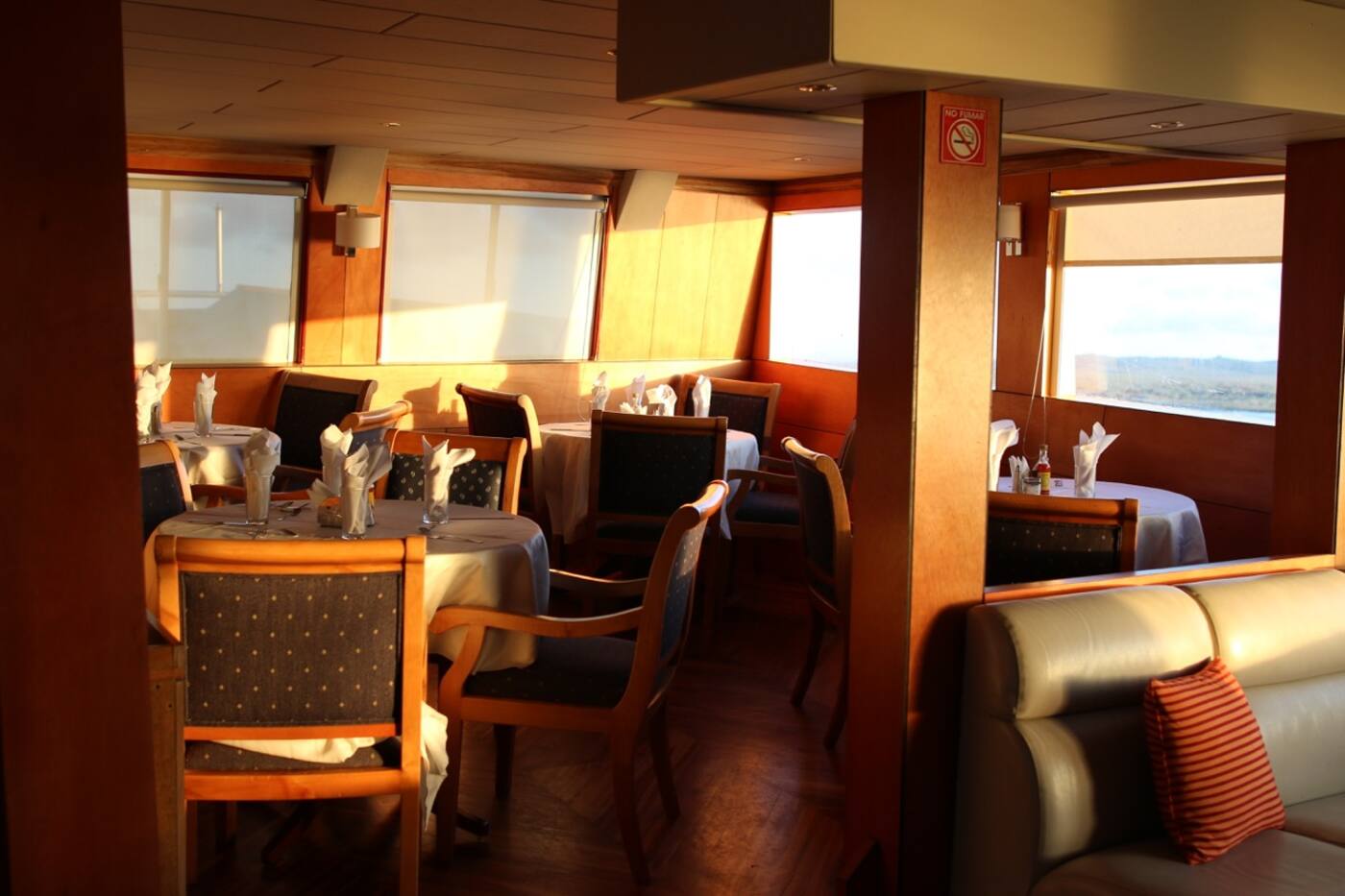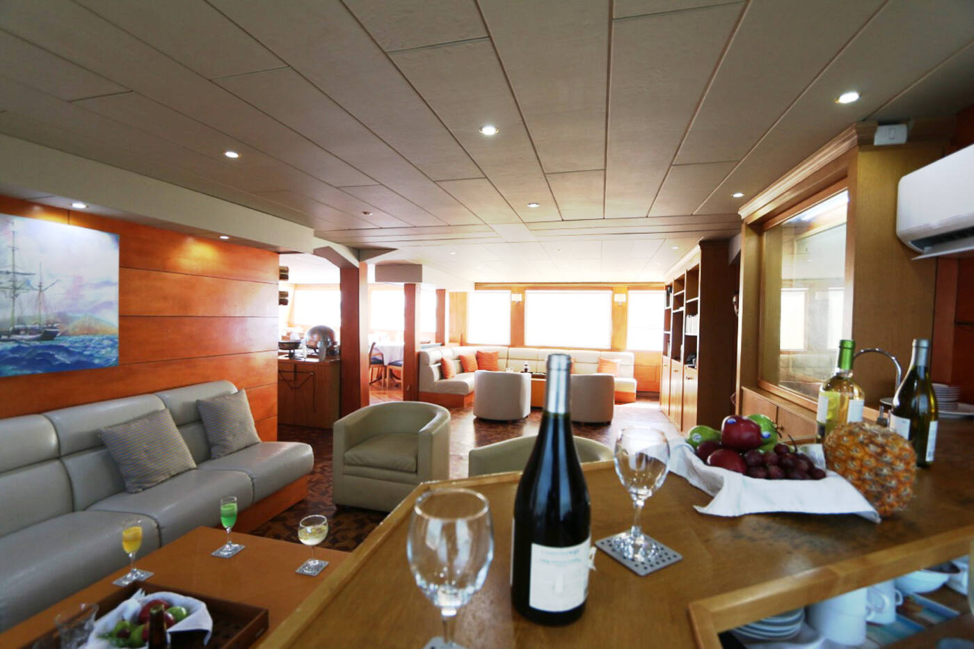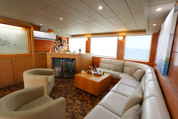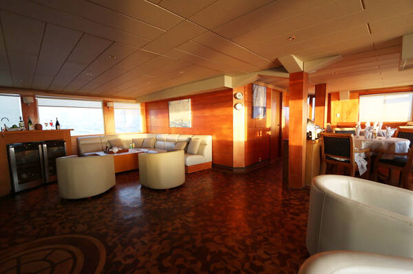 Katamaraanil on mugav söögisaal ja salong koos raamatukogu, TV, DVD, stereo varustuse, jäämasina, veepuhastaja, seifi, esmaabi varustusega. Katamaraani kaks baari serveerivad värskendavaid troopilisi kokteile. Laeval on vaateplatvorm ja ruumikas päikesetekk lamamistoolidega, kus on mõnus Galapagose võrratut maastikku nautida.