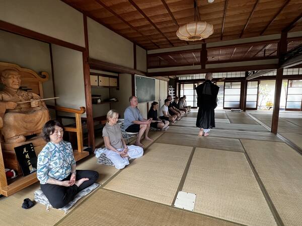 Daisen-in templis proovime Zazen meditatsiooni. Istume kohaliku munga juhendamisel lootospoosis tasa-tasa. Munk käib mediteerijate vahel ringi ja aitab keskendumisele kepiplaksatustega kaasa.