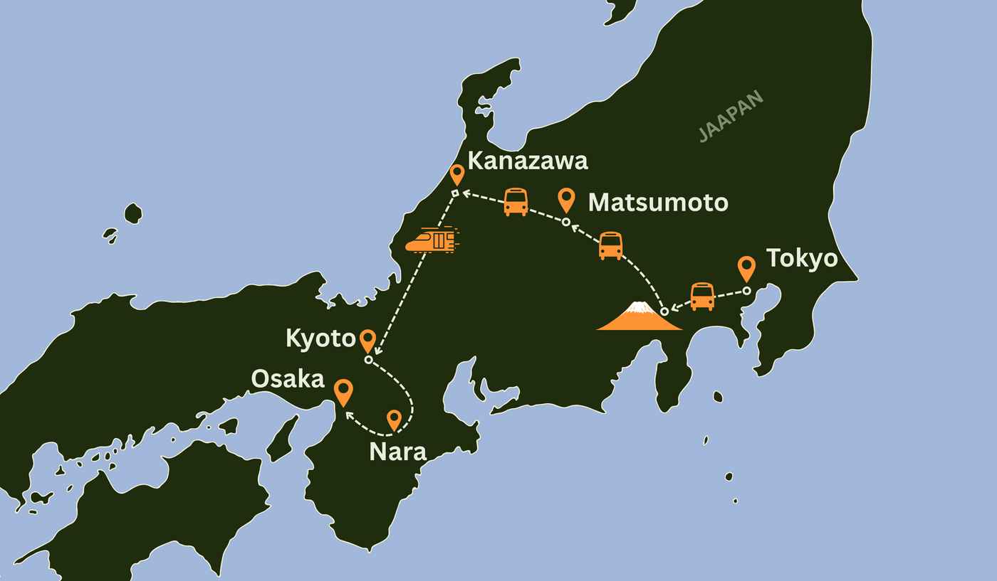 Alustame pealinna Tokyo paari päeva pikkuse avastamisega ning seejärel suundume püha Fuji mäe poole. Hakkame sõitma ookeani rannikult põhja suunas, teisele poole mere äärde Kanazawasse, peatudes vahepeal traditsioonilistes külalistemajades ja avastades Jaapani põliskultuuri. Läänerannikult sõidame tagasi lõuna poole Kyotosse, kus peatume pikemalt, ning reis lõppeb Osakas. Sinna sõites külastame ka iidset Nara linna. Kokku moodustub Kuldne Kolmnurk.