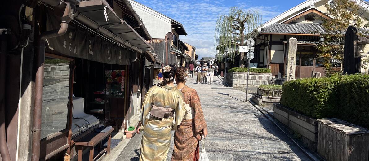 Seejärel jalutame mäest alla Gioni kvartalisse, mis on Kyoto üks peamisi geišade piirkondi. Jalutades mööda prillikivina läikima löödud tänavakesi, imetledes lilleõite ja pajupuude maailma ajaloolisi linnamajakesi ja hubaseid teetubasid, tunnetame, kuidas meie asisesse maailma tuuakse poeesia ja salapära võlu.