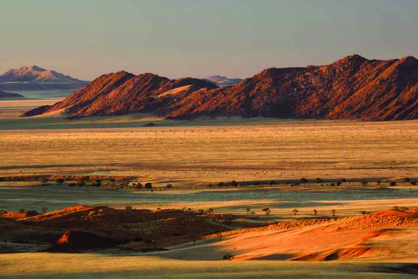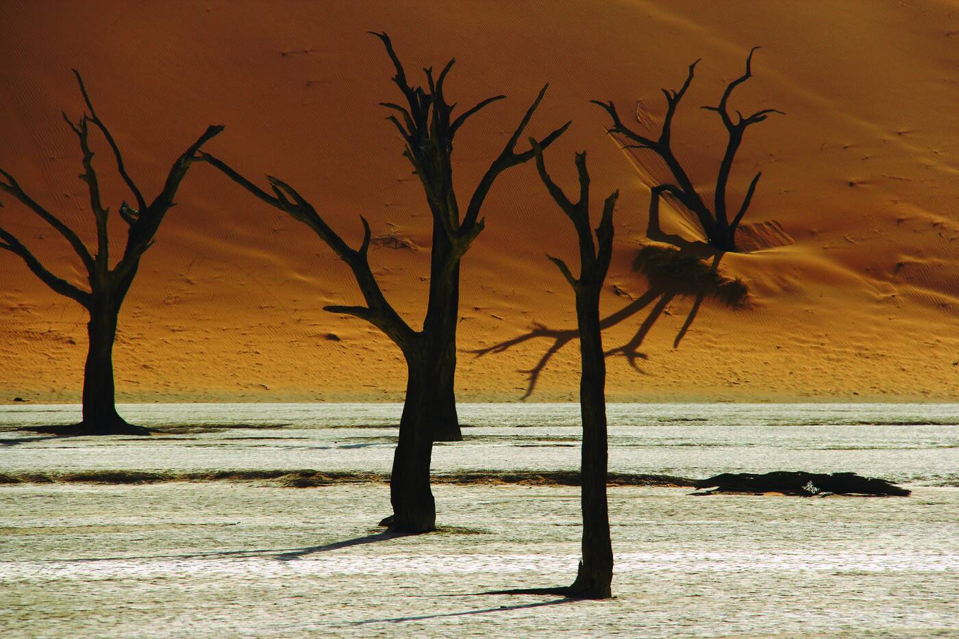 Sossusvlei rikkalikud ookerkollased liivadüünid pakuvad üht kõige meeliköitvamat vaadet. Düünide tipud tõusevad 320 meetrini! See on ajatu kõnnumaa maailma vanima kõrbe südames. Maailma kõrgeimate düünide mõõtmetega võrreldes paistavad meie jalajäljed nagu lõpmatusse suunduvad putukarajad. Mõõtmatus üksilduses tundub inimese eksistents kummaliselt tähtsusetuna. Valged saviväljad moodustavad terava kontrasti punase liiva ja ääretu sinise taevaga. Udust sõltuvad loomad ja taimed otsivad lämbe kuumuse eest varju liiva alt ja vanadest kaelkirjakuakaatsiatest. Üks nendest väljadest, Dead Pan (Surnunõgu), on suur, tontliku ulatusega kuivanud valge savi väli, mida rõhutavad iidsete kaelkirjakuakaatsiate jäänused. Akaatsiate vanuseks on süsinikumeetodiga määratud 500 kuni 600 aastat. Sellel ajavahemikul peatas liivadüünide vöö teke Tsauchabi jõe voolu ning puud surid. Maastikku kutsutakse Namiibia kohalikuks Salvador Dali “maaliks”.