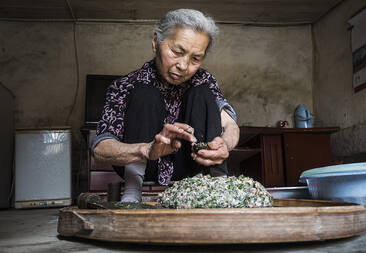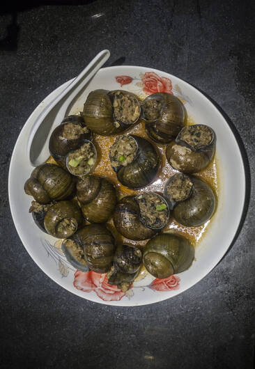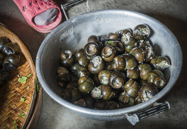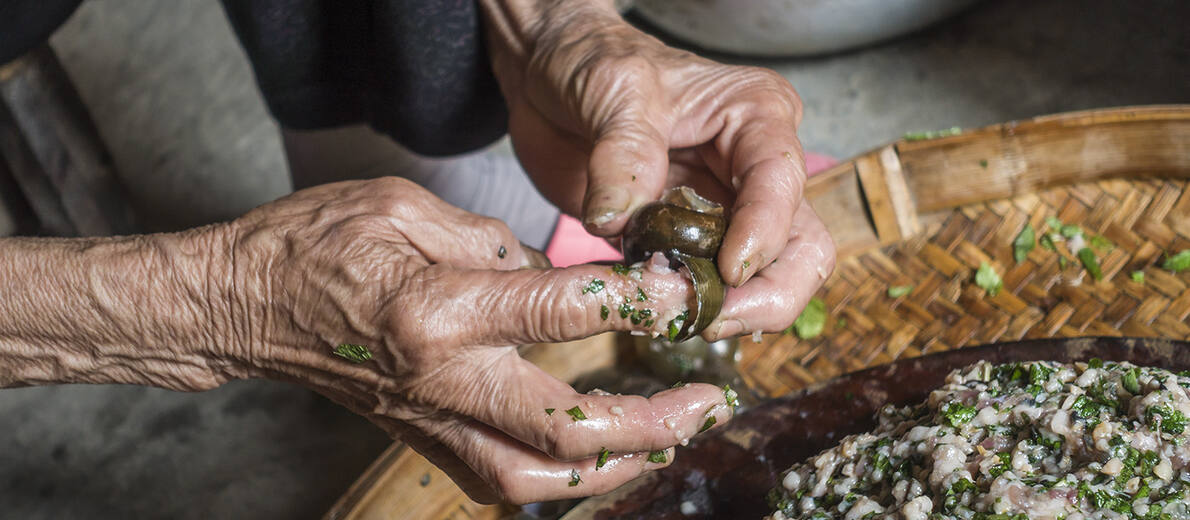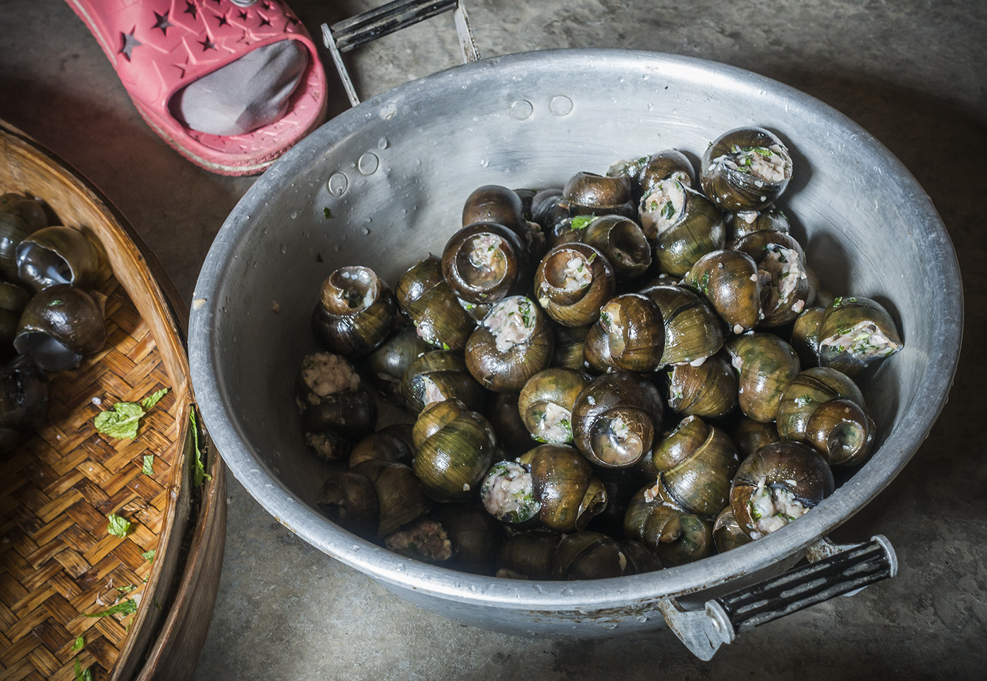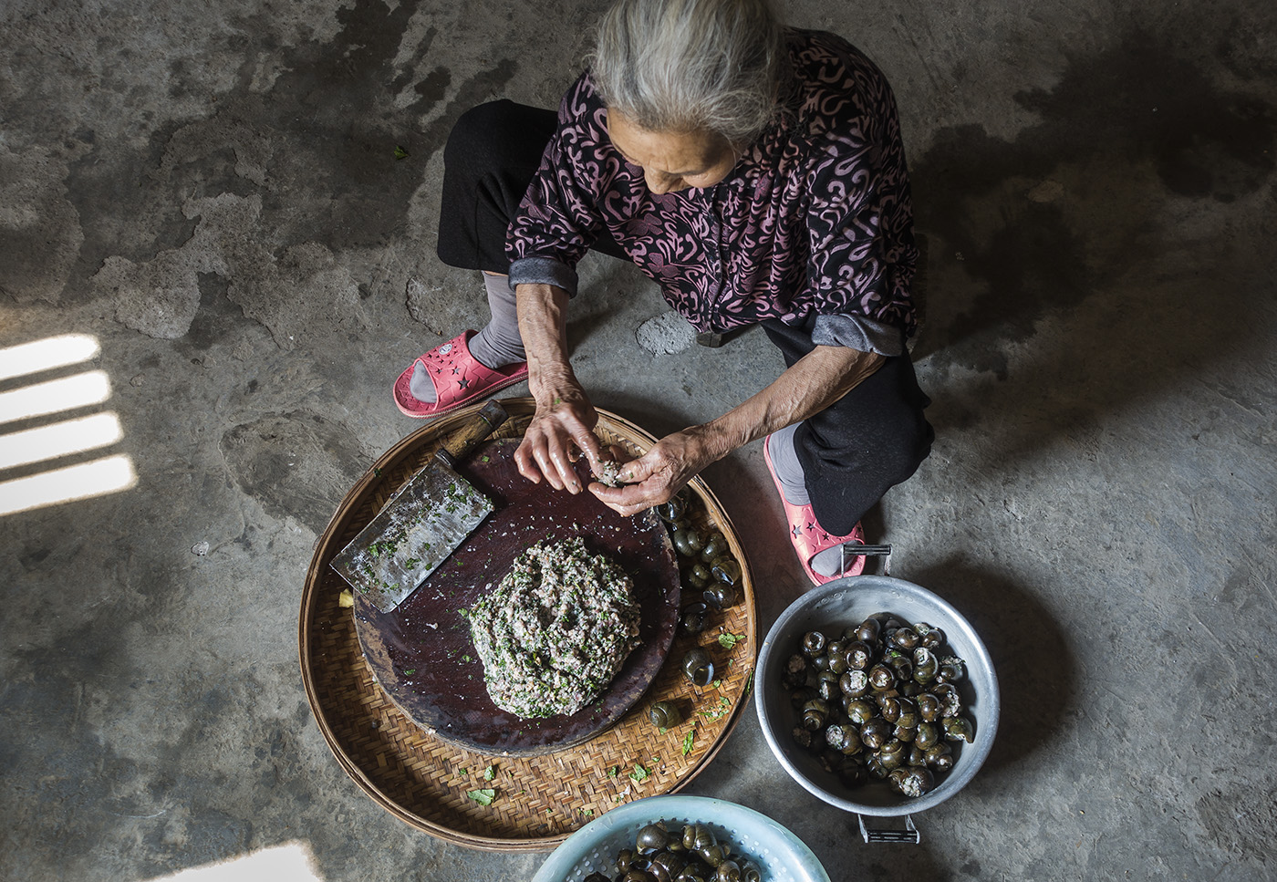 Kui ma oma Yangshuo ümbruse rattaretkel Yi Ma külakesse jõudsin, oli 71 aastane Bing Ru Yun jõudnud juba pooled ettevalmistustööd pidusöögiks ära teha. Nimelt oootas ta nädalalõpuks külla oma viit last koos peredega ja sel tähtsal puhul oli ta otsustanud neile pakkuda tigusid traditsioonilisel moel. Et roog ikka õige maitsega saaks, tuleb tigusid pärast püüdmist (ilmselt oleks õigem väljend 'pärast korjamist') nädal aega puhtas vees hoida. Selle aja jooksul jõuavad teod nii oma kojad kui ka iseendid kenasti puhtaks pesta.