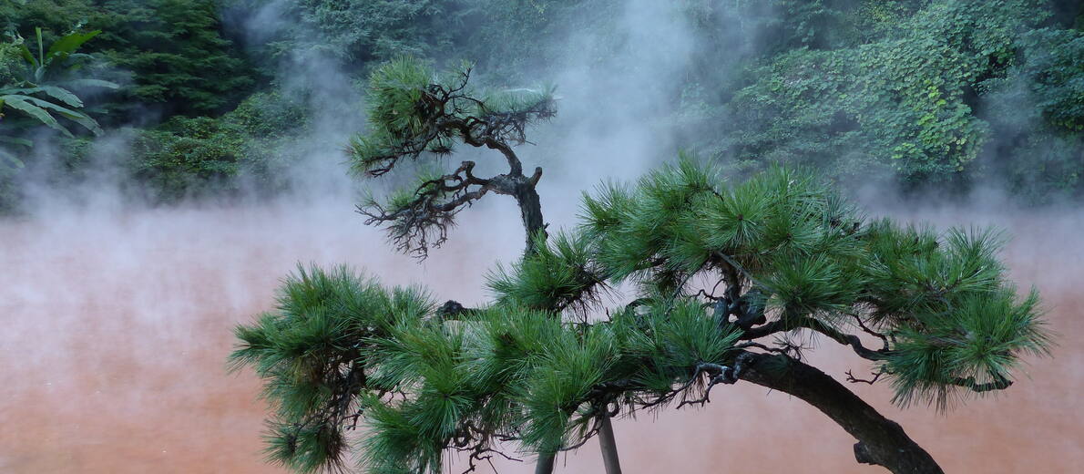 Fuji mäe kõrval udus. Pistsin pea telgiuksest välja. Seljataga oli esimene öö Jaapanis. Sadas vihma, nagu klõbina peale telgi katusel olin juba öösel oletanud. Kümne meetri ulatuses õõtsusid tuules puude võrad. Need olid mulle tundmatud lehtpuud. Ühe kohta nende seast teadsin, et ta nimi on kikkapuu. Kuid võimas tüvi ei meenutanud põrmugi samasse perekonda kuuluvat ja Eestis kasvavat harilikku kikkapuud. Harilik kikkapuu on umbes inimesekõrgune põõsas, mis kasvab Lõuna-Eestis Koiva jõe ääres. Siinne kõrge puu meenutas oma hallika koorega pigem leppa. Tema võrast rippus alla liaane. Tüvel turritasid rohekad pöidlapikkused kivi-imara moodi sõnajala lehed. Kaugemaid puid suurt ei paistnud, sest vaadet varjas piimjas udu. Tundus arusaamatuna, miks vahel tormihoogudeks paisuv tuul udu laiali ei ajanud. Eestis see nii olla ei saaks. Kuid samasugune ilm püsis siin õhtuni välja. Asusime umbes ühe kilomeetri kõrgusel merepinnast, Ashi järve ääres Togendai kämpingus.
