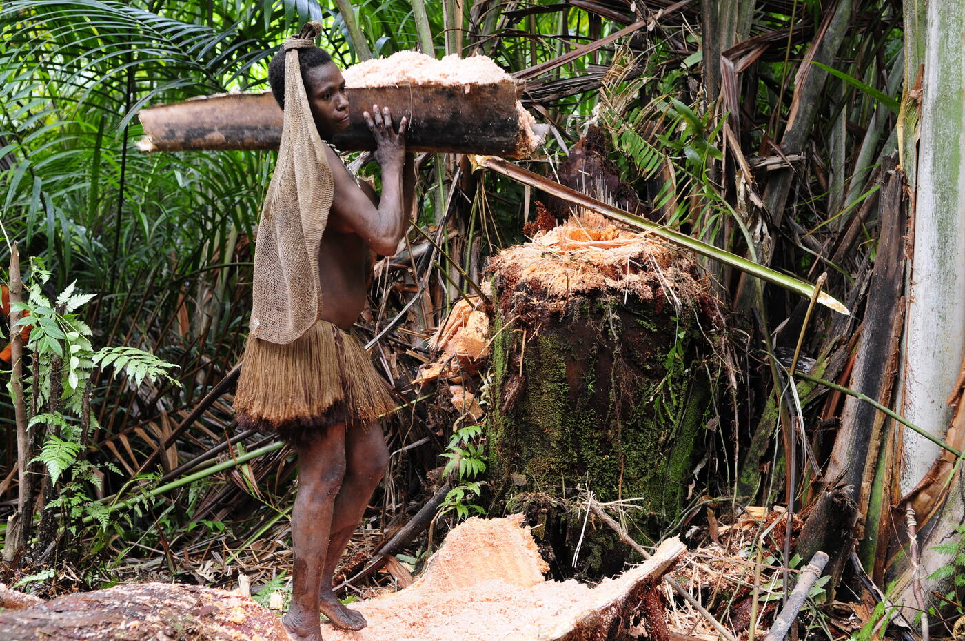 Ühel päeval võtame käsile toimingu, mis on korowaide jaoks peaaegu rituaalse tähendusega. Meid kutsutakse kaasa saagopalmi langetamisele. Kaks meest vibutavad kordamööda hoogsalt kivikirveid ja ergutavad üksteist meloodilise vilega. Tüse tüvi variseb maha vähem kui poole tunni jooksul. Töö läheb suhteliselt kiiresti seepärast, et läbi tuleb raiuda üksnes palmi koor. Tüve sisemus koosneb täielikult pehmest ja mahlakast säsist. Kui puu maas, asuvad tegutsema naised. Mitmekesi veidraid pikavarrelisi kivist peaga hakkimisriistu kasutades purustavad nad säsi peeneks pudiks. Tööd saadab naiste rütmiline ühislaul. Seejärel kantakse hake lähedalasuva oja juurde, asetatakse palmilehest renni ning uhutakse läbi rohke veega. Renni põhja koguneb ollus, mis näeb välja nagu roosakas tärklis. Kui seda näppudega mudin, krudiseb see samamoodi kui meie kartulijahu. Korowaide jaoks ongi tal ligikaudu kartulijahu tähendus. Kuivatatult valmistatakse sellest kõikvõimalikke küpsetisi ja muid toite. Saagojahu on korowaide kõige olulisem toidus ja peamine kalorite andja. Kuigi metsast otsitakse ka jahiloomi ja söödavaid putukaid ning jõest püütakse kalu ja teisi väikseid veeloomi, on saagojahu see, millest saab n.ö igapäevast leiba.