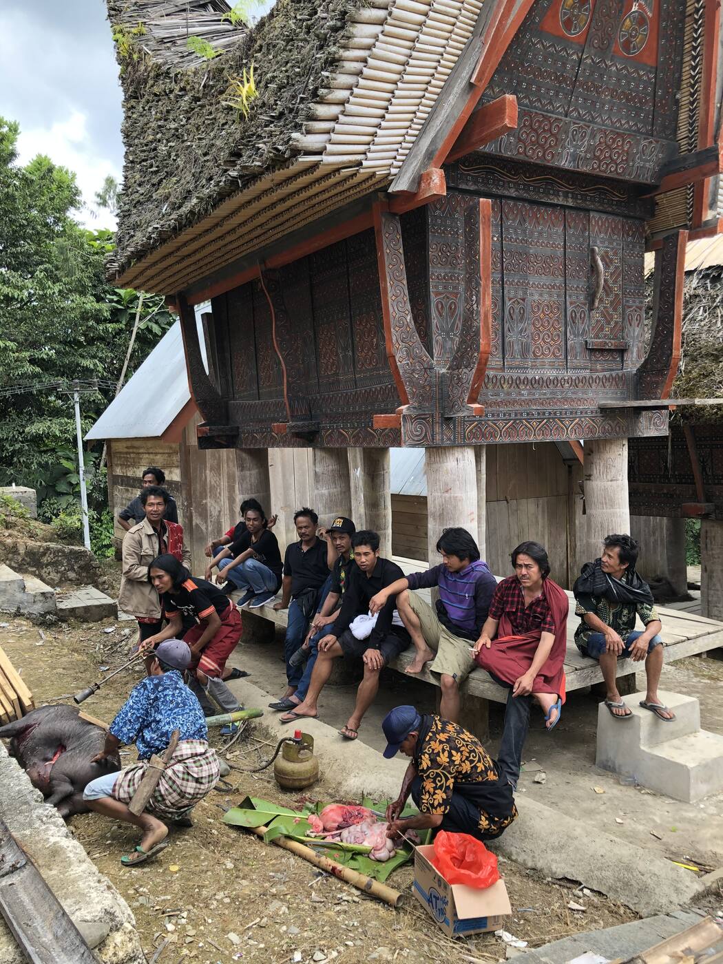 Tavapäraselt kestavad matused torajade juures viis kuni seitse päeva. Meie kohale jõudes olid Palawas pidustused juba täies hoos. Külavanem seisis keset platsi bambuslattide külge kinniseotud sea kõrval ja rääkis üle kriiskava seakisa valjuhääldaja torusse midagi, mida võis parima tahtmise juures pidada lühikeseks palveks. Paari minuti pärast seakisa vaibus, veri valgus mulda ja siga lohistati pisut kõrvale. Sealsamas kärsatati leeklambiga seaharjased. Üks kondine mees tükeldas matšeetega looma kiiresti ja vilunult ning ulatas verised sealihatükid asjaomaste inimeste kätte. Veeti kohale järgmine oma saatusega kõvahäälselt mitteleppiv siga, kelle kisa nakatas veel pooltsada saatusekaaslast eemal aedikus. Ninarõngast pidi juhatati kohale vesipühvel. Magusast verelõhnast läbiimbunud õhku hingates meenus kangesti üks põrgustseeniga Hieronymus Boschi maal.