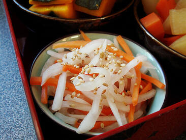 Viiluta daikon ja porgand õhukesteks kangideks, raputa peale 1 tl soola, lase seista 20 min. Juurviljadest nõrgub välja vedelik. Nõruta ja pigista vedelik välja. See muudab salati mõnusalt krõmpsuvaks. Lisa juurviljadele kastme komponendid. Lase külmas seista veel 30 min et maitsed saaksid seguneda. Peale võib raputada seesamiseemneid.